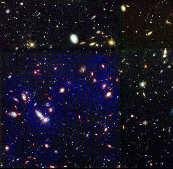 还有,如果我们观察星系的引力透镜效应,即有多少光被前景星系弯曲、放大和扭曲,我们就可以推断出星系中存在的质量总量。