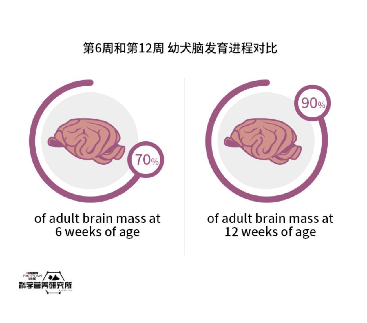 以幼犬为例,其在出生后的几个月中,大脑会经历迅速发育的过程。通过下图,我们可以看到在幼犬出生后第6周时,大脑已经完成了70%的发育,而到第12周时,大脑的发育进程已经达到90%。【1】因此,在生命之初及时进行营养干预,可以促进宠物大脑发育,从而获得更强学习能力,以便在未来更好的融入社会之中。