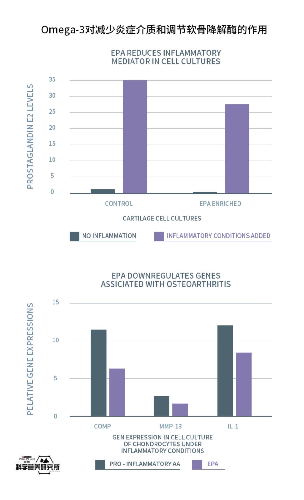在实验中,我们发现受关节炎影响的细胞中,软骨降解酶指数增高,而抑制降解酶指数则呈现下降态势。【5】【6】结合之前的研究成果,omega-3脂肪酸可减少炎症的发生,而炎症则是导致关节软骨破裂的触发性因素。