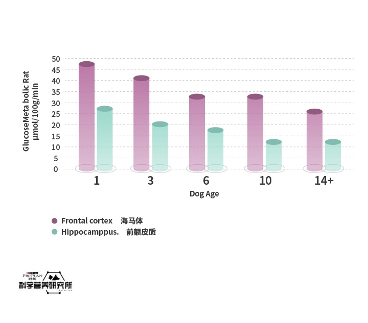 相比幼犬,老年犬的大脑则有着极为不同的营养需求。在冠能的另一项研究中表明,7岁以上的狗狗大脑不能有效利用葡萄糖作为能量来源。与其六岁时相比,大脑某些区域葡萄糖代谢总体上减少25%。其中,额叶皮层和海马区,这两个对认知功能至关重要的区域,葡萄糖利用率降低最为明显(详见下图)。【3】严重时,可发展成为认知障碍综合征(CDS)。