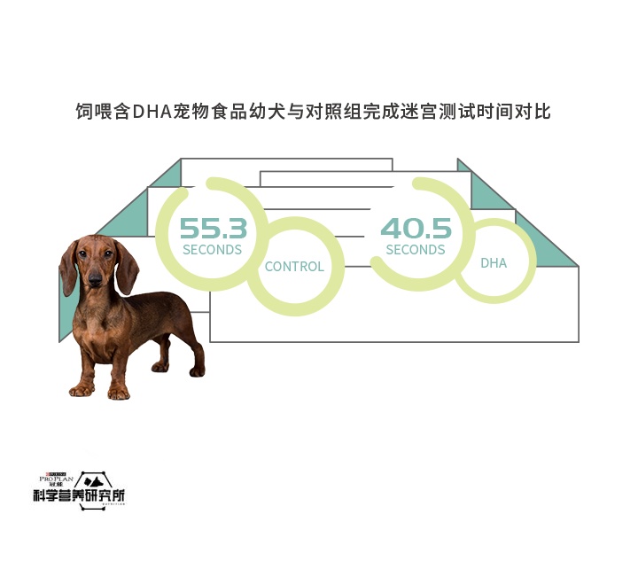 另外,我们发现DHA水平不足会影响犬类脑神经与视觉发育。而当为幼犬提供含有充足DHA营养成分的食品,能够有效提升幼犬的记忆力、训练能力和解决问题的能力。在冠能的一项研究中,曾对3-16周龄的幼犬喂食含有DHA营养的宠物食品,结果表明相比对照组,受试组完成迷宫测试要快25%(详见下图)。【2】因此,对于幼犬而,只有在生长发育阶段,为其提供足够的DHA才能保障大脑发挥更大潜力。