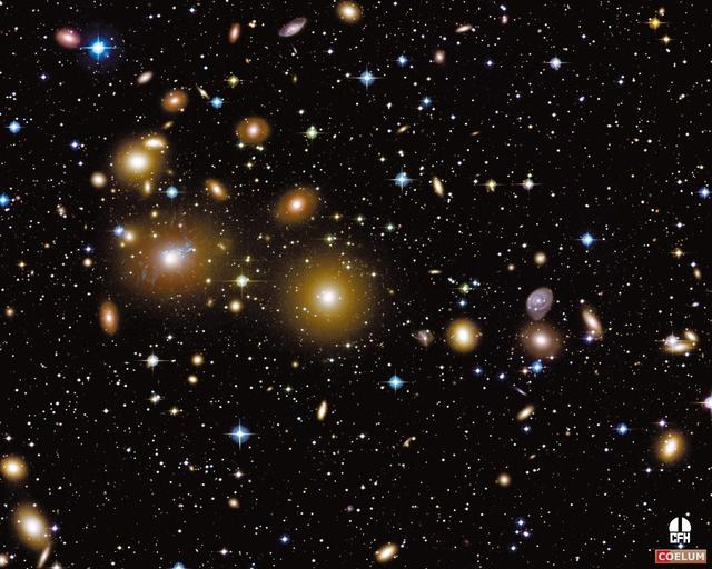 在更大的尺度上,单个星系可以独立的存在与宇宙中(这种星系叫场星系),也可以由少数的几个星系组成一个集群(如:我们的本星系群),也可以由更多的星系(数百到数千)组成一个星系团!如果我们再观察更大的尺度就会发现,这些星系群、星系团沿着巨大的丝状结构排列,延申数十亿光年。在这些细丝之间就是巨大的宇宙空洞,一个低密度区域,其中只存在少量的星系和恒星。