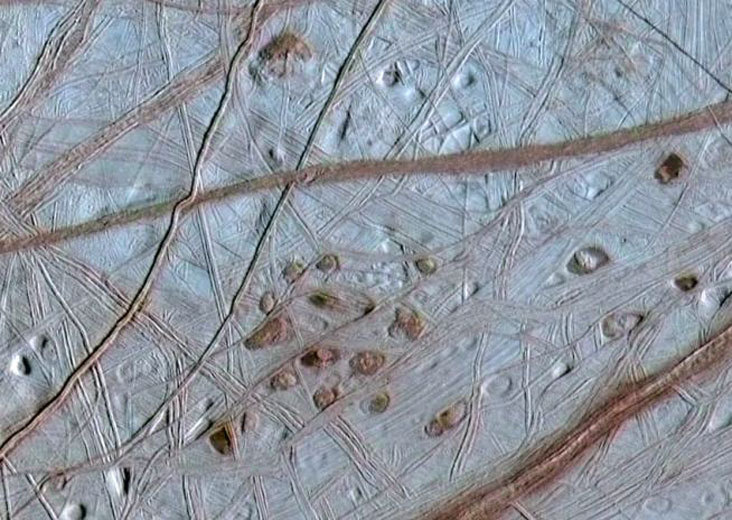 冰壳上的巨大折线裂缝和山脊,与地球北冰洋上的海冰裂缝非常相似,只是要宽出10多倍,更像是板块构造运动的结果。