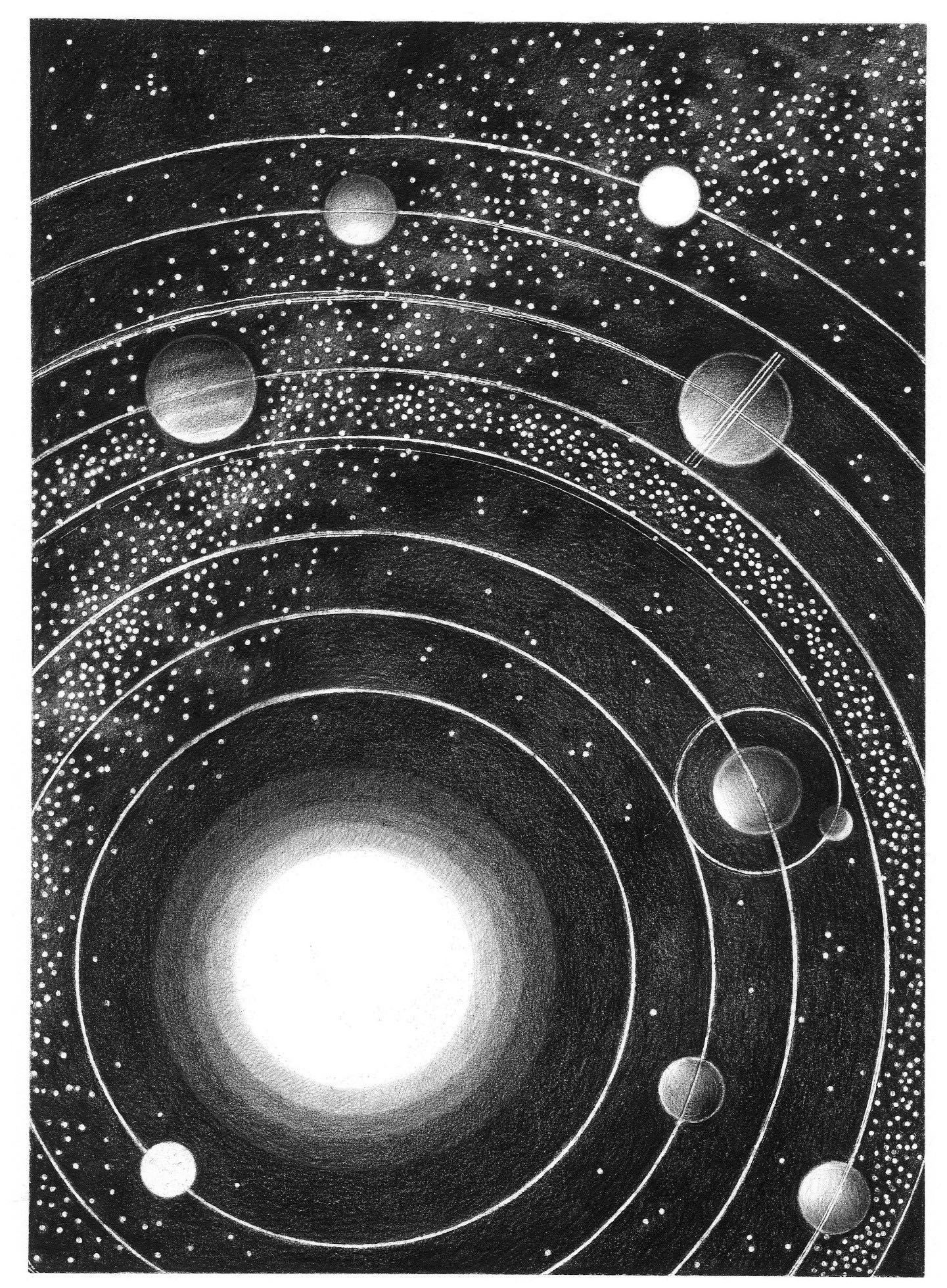 第一次伟大的科学革命是 2600 年前由阿那克西曼德( Anaximander )发起的,他想弄明白为什么太阳、月亮和星辰都围着我们转。于是宇宙变成了下面这幅图的样子:
