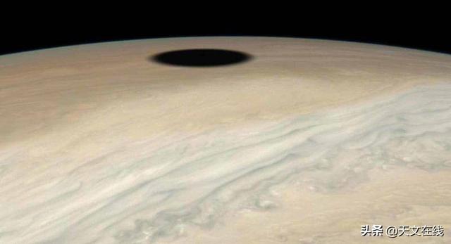 美国国家航空和宇宙航行局的朱诺号捕捉到了木星上这并不吉利的一幕,显示在巨大翻腾着的气体云层之上有一个巨大的黑点。这看上去很吓人,但是有一个很合理的解释:这是由木星一个有许多火山的卫星,木卫一,投下的影子。