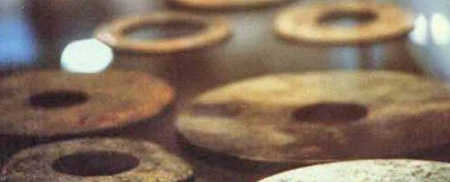 在这些古怪墓穴旁更发现了多达 716块由石头制成的碟片。这些石碟厚度约两公分,直经约30公分,重量约一公斤,中间有一个圆孔,从中间圆孔向外延伸出双重螺旋沟槽到边缘。