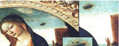 15世纪的作品,这幅画收藏在意大利佛罗伦斯旧宫中。画中在空中右上角边框的位置有个很明显的盘状物体,放大局部细节图可以看到和现在的UFO多么的相似。
