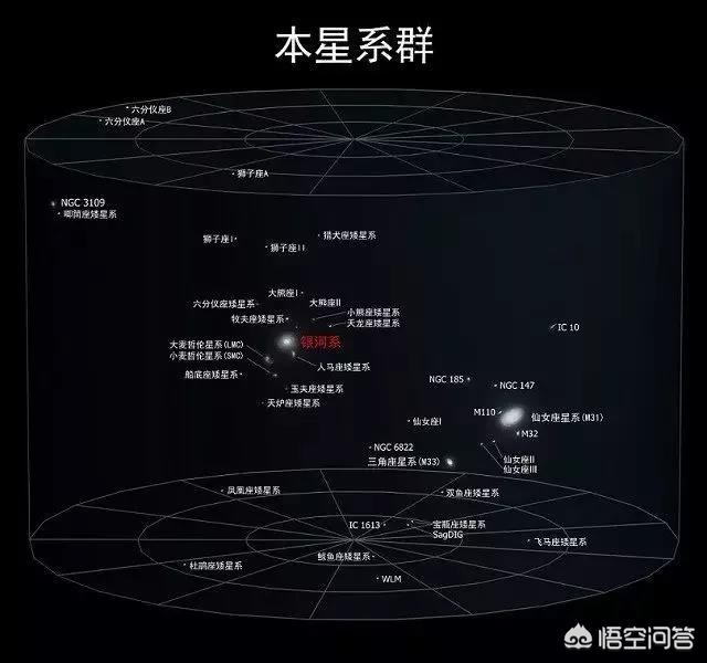 而银河系看起来非常大,但它也只是本星系群里面的一个星系而已。本星系群还有很多其他的星系。其中最大的是仙女座星系,银河系也算是很大的,排在第二位,而零零散散还有很大很多星系。