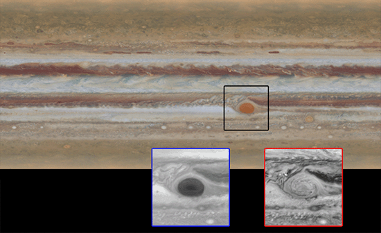 经过比较第一张和第二张图象中木星云层挪动,在蓝色波长和白色波长范畴内发明大红斑具有之前未观察到的共同丝状特点。