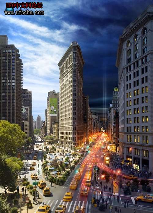 摄影师斯蒂芬-怀克斯拍摄的时代广场 据外媒报道,艾青的名句“因为我对这土地爱得深沉”用于纽约摄影师斯蒂芬-怀克斯身上再合适不过了。为了表达他对纽约城“深深的爱”,怀克斯运用高科技方法将纽约同一地段从早到晚的照片组合到单张照片中。纽约的日夜之景在一张照片中交融形成了奇特的景象。