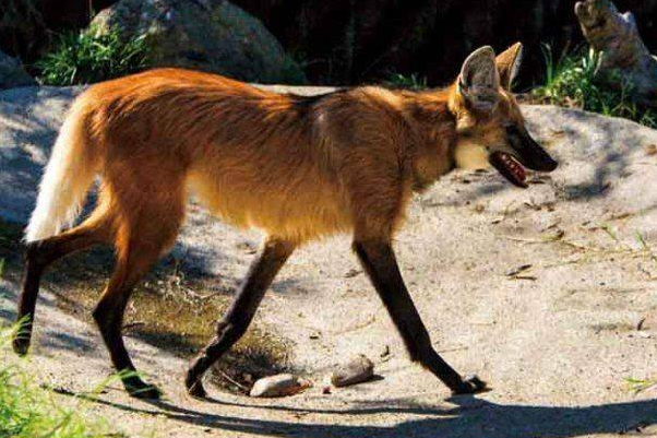 鬃狼是南美最大的犬科动物,同时也是一种珍稀的犬科动物。背部和腿部皮毛呈黑色,体侧皮毛为红褐色,像穿着一件金红色的衣裳,尾巴和喉咙处为白色。腿细且长,身体苗条,一双大耳朵向上直竖。它们不狩猎大型猎物,牙齿不发达。