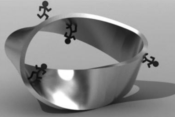 莫比乌斯环其实就可以将它看作一条纸片,在翻转了180度之后将两头进行粘连,这时它就形成了一个看不出正反面的环,如果将一只蚂蚁放在这个环上,那么它就仿佛能够从环的一面走到另一面,并且一直走下去走不到尽头,比如《恐怖游轮》等电影就使用了陷入循环轮回这样的恐怖意义。