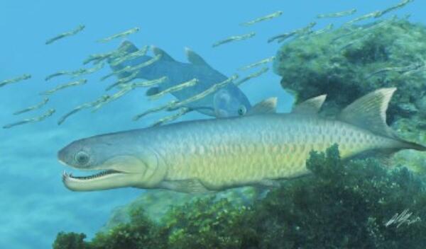 泥盆纪是地球鱼类的时代,处于3.5-4.5亿年间,当时诞生了许多凶猛的鱼类,其中就包括鲨鱼的祖先恐鱼。而在这个年代,还有一个鱼类不可忽视,它就是爪齿鱼,泥盆纪最凶猛的掠食者,其体内曾发现过恐鱼残骸。