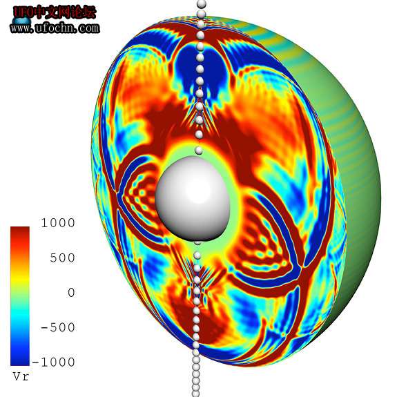 美国太空网报道,最新的一项研究表明,科学家称,通过观察恒星表面的波纹能够发现难以捉摸的黑暗物质存在的证据。这样的地表震动暗示某个奇怪、假设为暗物质的物体,也就是俗称的原始黑洞,曾经路经恒星。这些波纹提供了暗物质存在可观测到的证据。 图1 科研学者墨迹了原始黑洞的效应。原始黑洞被假设为产生暗物质的天体。这张图片论证了原始黑洞路经恒星中央产生的振动波。不同的颜色与原始黑洞的密度和振动的强度有关。 “关于暗物质的组成部分,则是个更大的问题。如果我们的确发现的是一个原始黑洞,它将符合所有的参数。”普林斯顿大学的Shravan Hanasoge说道,“鉴别这样一个原始黑洞,对于我们更好的理解早期宇宙以及暗物质,有着深远的意义。”