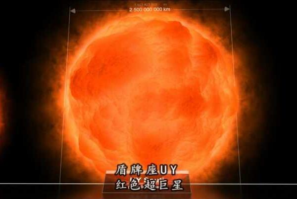 盾牌座uy是一颗位于盾牌座的红超巨星,它半径是太阳的1708倍,体积约为太阳的45亿倍,是人类现已知体积最大的恒星。根据科学研究表明,银河系是一个椭圆盘的形状,直径达到了16万光年,盾牌座uy就在银河系中,位列银河系十大恒星之首。
