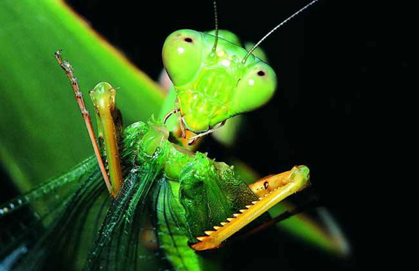 这种螳螂还喜欢吃着碗里的盯着锅里的,即使猎物已经进了嘴里,它们可能已经瞄准第二个猎物了。它们的眼睛双腿耳朵等等配合都比较密切,同时也很灵活,所以在自然界是天然的捕猎者。有人把绿巨螳螂vs巨人蜈蚣之间作比较,不过比较起来前者还是比较弱的,毕竟个头方面巨人蜈蚣就比较占有优势了,即使这样也没办法否认绿巨螳螂的强大。
