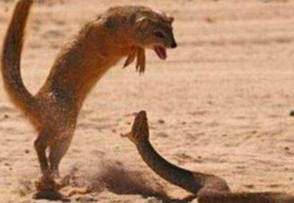 假如蛇獴和蛇相遇了,它的毛会全部竖起来,而蛇看到蛇獴也是相当害怕静止不动,蛇獴会前去挑衅。蛇可能生气了准备去咬蛇獴,但是蛇獴身子很是灵活,不容易被蛇咬到。直到蛇没有力气了,蛇獴就会突然从后面咬住蛇的脖子,将蛇咬死并且吃掉。