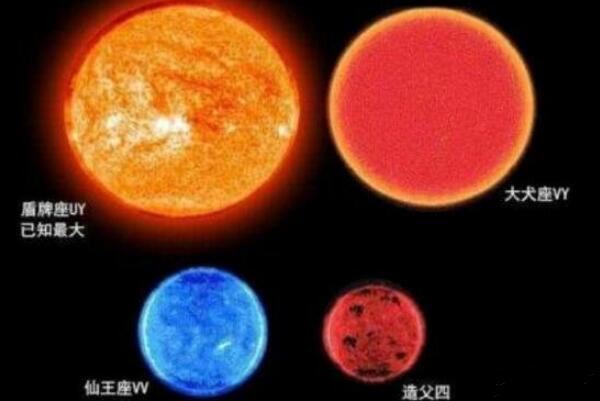 在发现盾牌座UY前,最大的红超巨星一直是大犬座VY,它的平均质量为太阳的17倍,半径是太阳半径的1420倍,体积约为太阳的28.6亿倍,是宇宙已知第七大恒星,位列银河系十大恒星排行榜第二位。