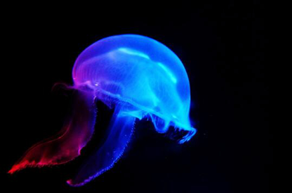 像是果冻一样的海月水母本身是透明无色的,但在灯光的映衬下,能够变化出梦幻般的色彩。并且其体态优美,圆盘状的伞(也就是海蜇的蛰皮部分),完全张开后,就像水中的一轮明月。