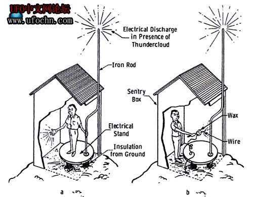 富兰克林是第一个提出用实验来证明天空中的闪电就是电的的科学家,那是在1750年。[1] 但是第一个付诸于实践的却是法国科学家——他像图中那样观察到了铁棒上的火花,不过没有用身体近距离去碰铁棒。此后,还有一些研究者也做了类似的实验。在俄罗斯有一位物理学家在模仿这个实验时,因为操作不慎被雷电击死。
