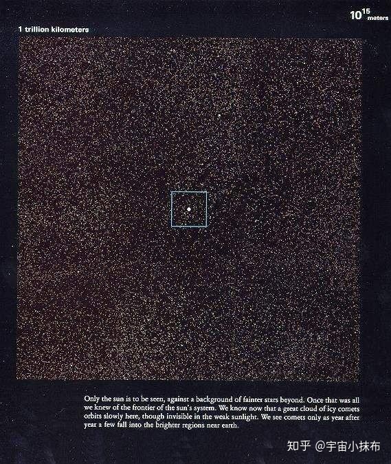放大十倍来观察以繁星为背景的太阳系。说是繁星,其实与太阳最近的恒星--半人马座比邻星都是在4.22光年开外的。下图中的亮点仅仅只是背景上离得八丈远的星星呢,并不是太阳系的一部分。   一百亿公里