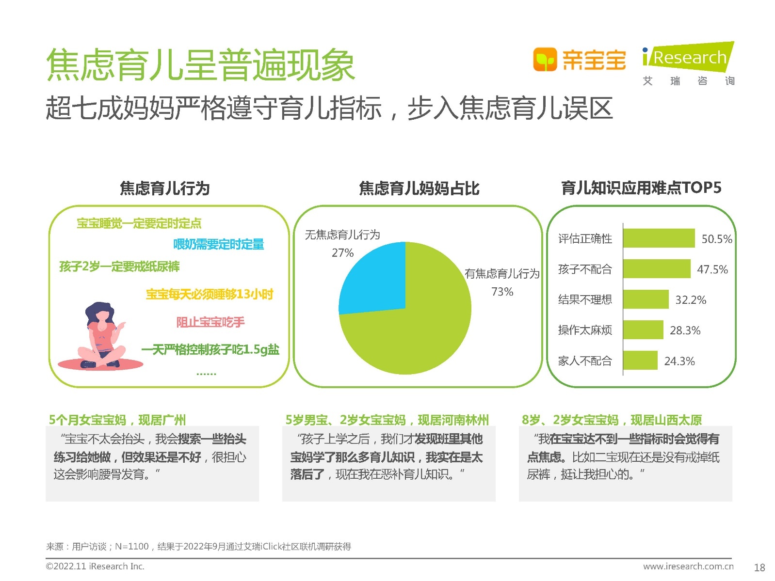 科学育儿是一个复杂体系,宝妈对育儿知识的依赖度在宝宝4-6个月时达到高峰。焦虑育儿呈普遍现象,超七成妈妈严格遵守育儿指标,步入焦虑育儿误区。正确的科学育儿观不应为家长制造焦虑,放平心态、更有耐心、系统性学习是解决焦虑育儿之关键。