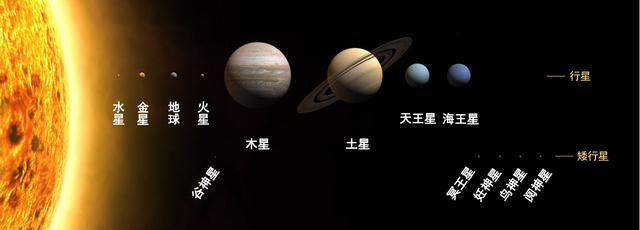 ③行星系统高度分化,四颗内行星——水星、金星、地球、火星,属于类地行星,体格小、密度高,拥有固态表面,而四颗外行星——木星、土星、天王星、海王星,属于类木行星,体格大、密度小,气态表面主要由氢元素氦元素气体构成。
