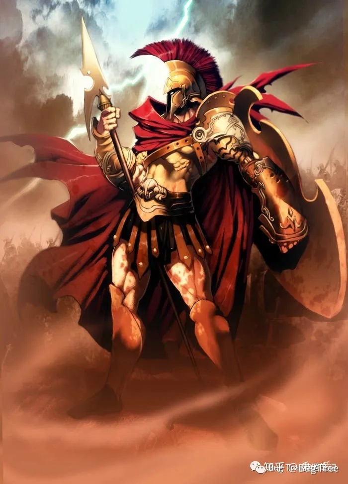 希腊神话中,战神Ares是第三代神王Zeus和天后Hera的儿子,同时也是爱神Aphrodite的情人,掌管战争。他相貌英俊,孔武有力,性格残暴好斗,象征着战争的野蛮杀戮。
